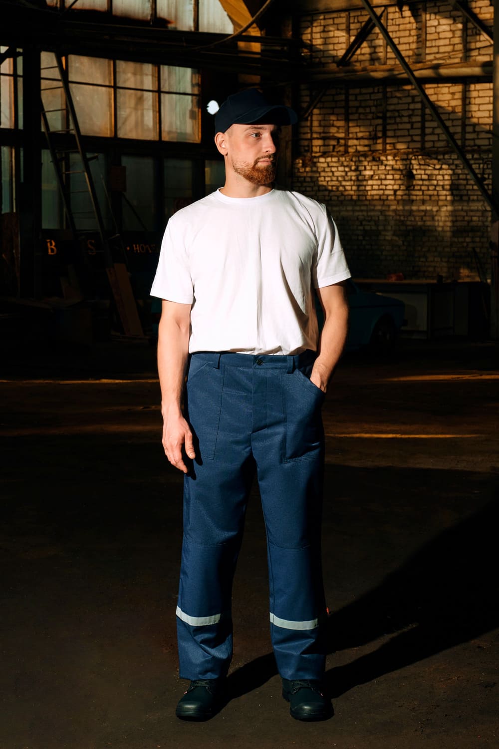 Брюки с застежкой гульфика на пуговицы, с боковыми накладными карманами, с притачным поясом. Наколенники. По низу брюк СОП 25 мм.