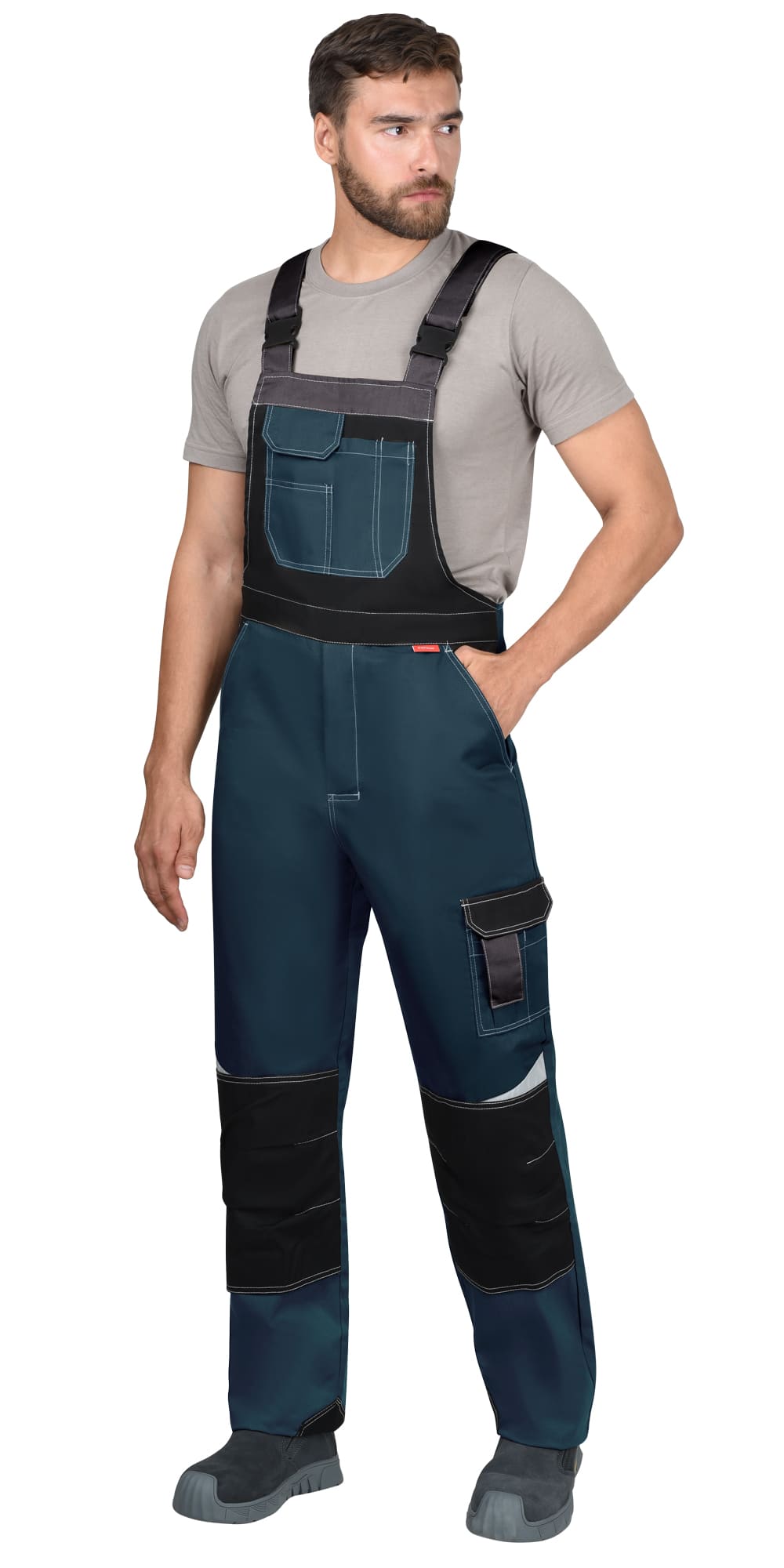 Полукомбинезон прямой с застёжкой спереди — гульфик с молнией и с застёжкой в правом боковом шве на пуговицы, с отрезной грудкой, с бретелями, с боковыми внутренними карманами на передних половинках, с накладными карманами на правой задней половинке и на левом боковом шве. Полукомбинезон с объемными наколенниками с нижним входом для амортизационного вкладыша. Бретели регулируются при помощи застежек-фастексов и резинки. В полукомбинезоне предусмотрены светоотражающие элементы, для обозначения сигнальной видимости.