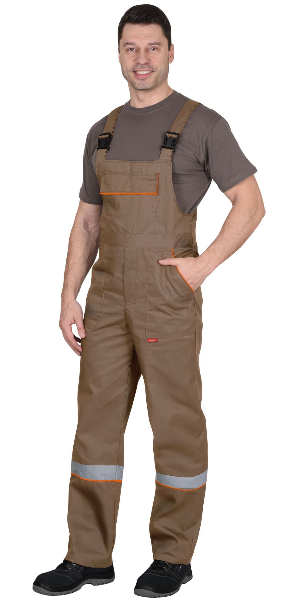 Полукомбинезон спереди с боковыми карманами и нагрудным карманом с клапаном, сзади с двойным карманом для инструментов у правого бокового шва на уровне колена. Полукомбинезон с бретелями