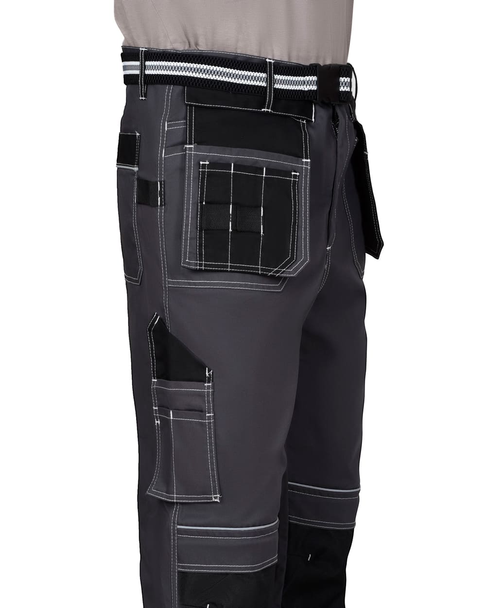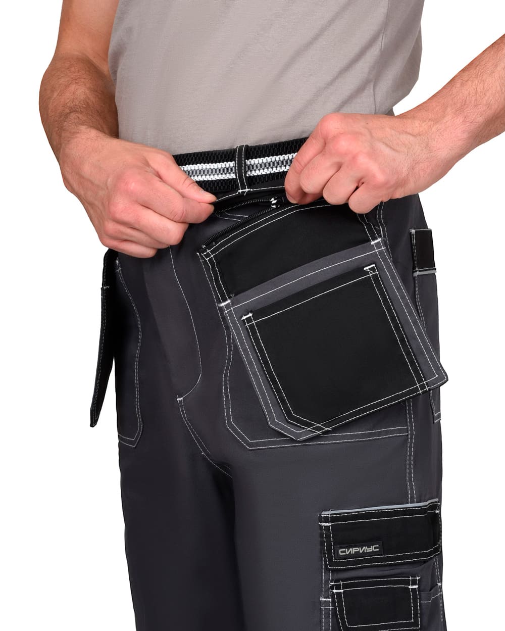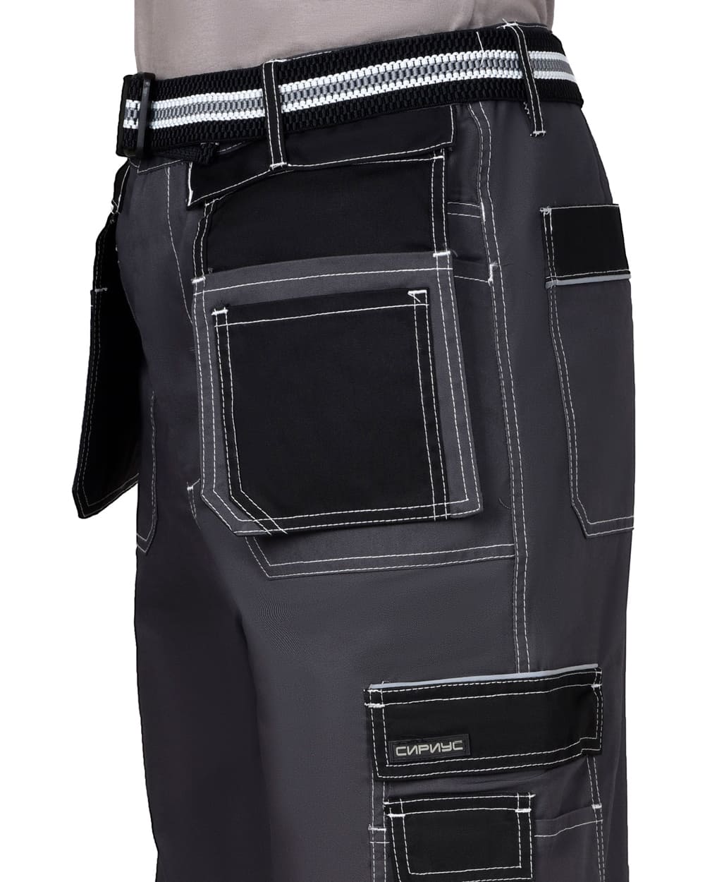 Брюки прямого силуэта, с отрезным поясом, с застежкой спереди на молнию (гульфик), с различными многофункциональными карманами, в области колен с усилительными накладками из устойчивой к истиранию, непромокаемой ткани, с возможностью размещения в них амортизационного вкладыша. Брюки комплектуются съёмным ремнём из эластичной тесьмы с пряжкой. В брюках предусмотрен кант СВ 3 мм для обозначения сигнальной видимости.