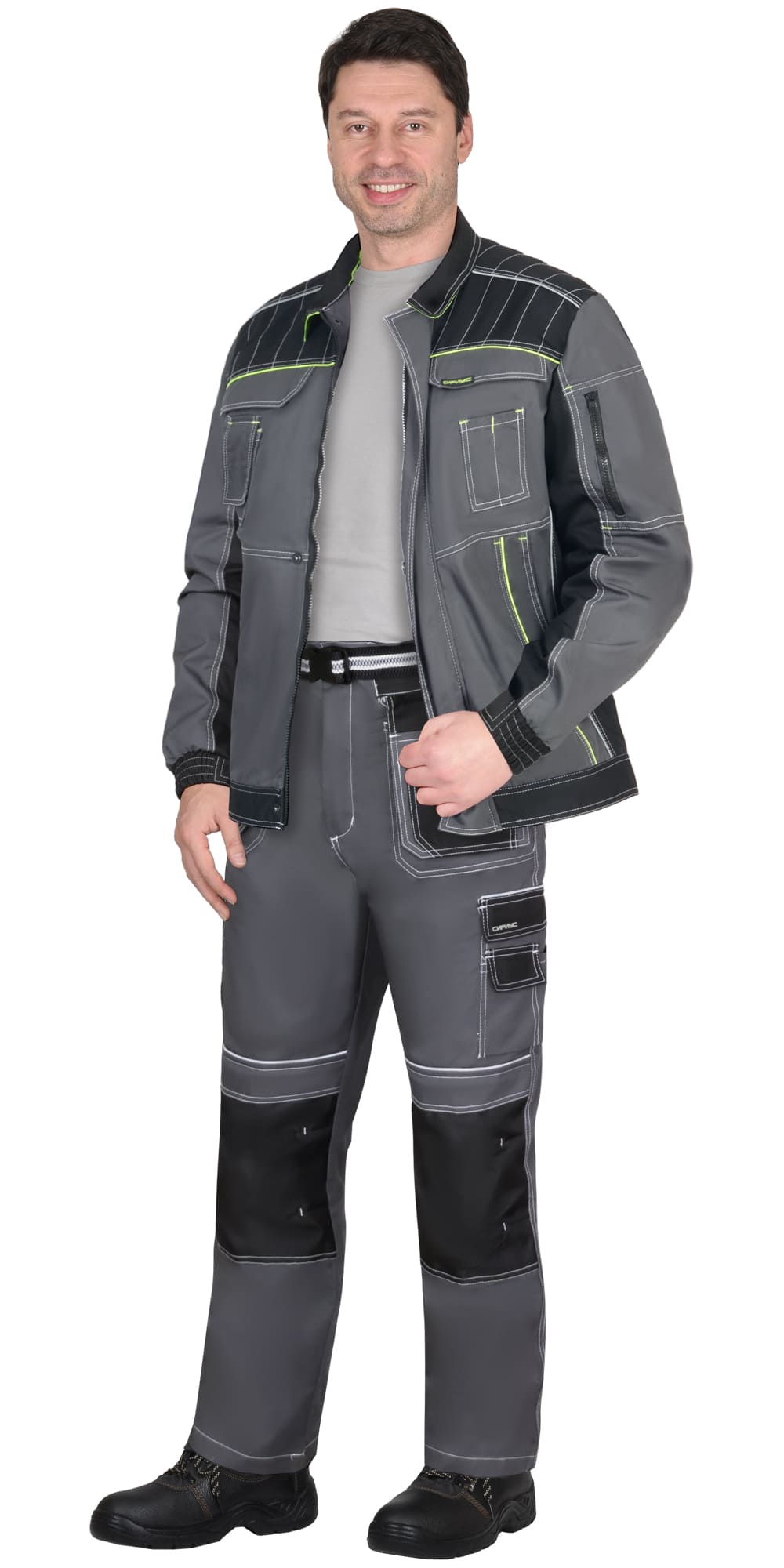 Куртка укороченная, прямого силуэта, с центральной застёжкой на молнию под ветрозащитной планкой, с отложным воротником, с различными карманами, с втачными рукавами с манжетами на резинке, на левом рукаве накладной карман с молнией. По низу куртки пояс с хлястиками по боковым сторонам с кнопками для регулировки объёма куртки понизу. В куртке предусмотрен светоотражающий кант и кант лимонного цвета для акцента видимости в тёмное время суток и на отдалённом расстоянии.