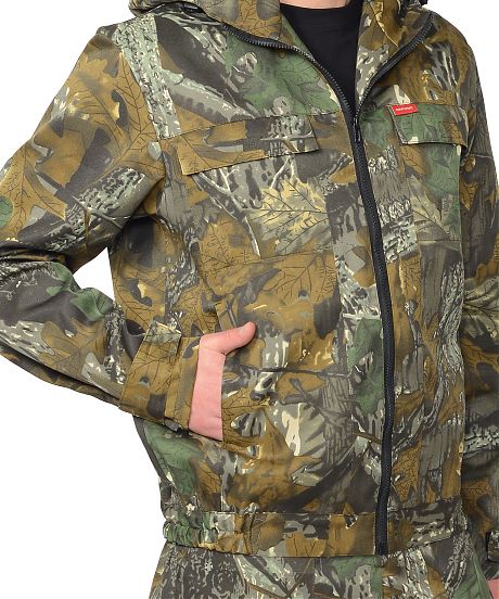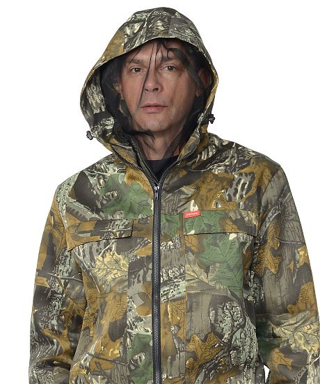 Куртка прямого силуэта, с застежкой на молнию, с притачным поясом, с втачным капюшоном с противомоскитной сеткой. Полукомбинезон с центальной застёжкой на молнию, с двумя накладными карманами с клапаноми и с боковыми накладными карманами с наклонным входом. Ширина по спинке регулируется при помощи зластичной тесьмы..Ткань: «CROWN-230» смесовая с ВО пропиткой: 80% п/э, 20 % х/б, пл. 230 г/м.