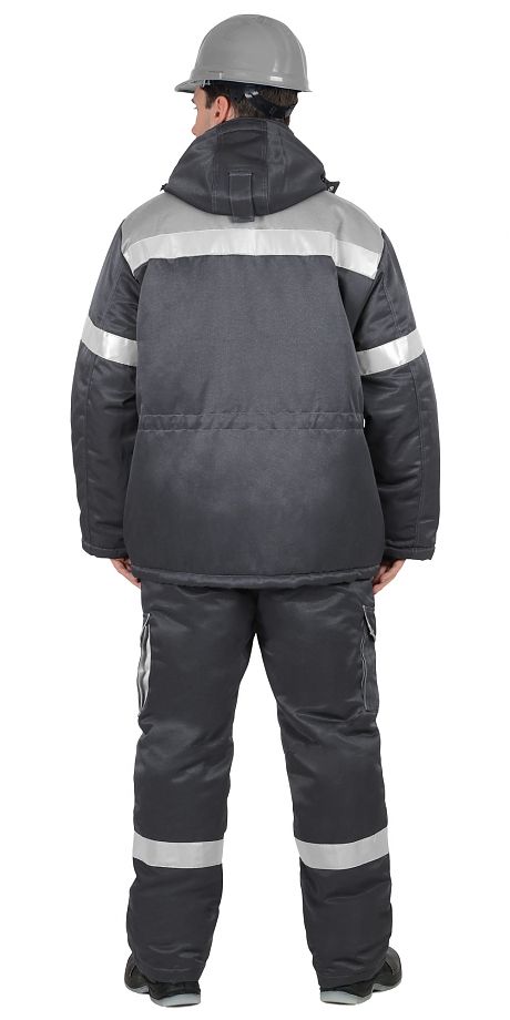 Костюм состоит из куртки и полукомбинезона.Куртка длинная прямого силуэта; с притачной утепленной подкладкой, с центральной застежкой на молнию, с ветрозащитным клапаном, отложным воротником, с верхним накладным фигурным карманом на левой полочки и с верхним прорезным карманом на правой полочки, нижними накладными полу объемными карманами с фигурным клапаном, застегивающимся на кнопку; с кулисой по линии талии.Полукомбинезон прямой; с притачной утепленной подкладкой, с регулируемыми за счет пряжек — бретелями; с притачным нагрудником; с центральной застежкой на молнию, с нагрудными накладными карманами, с двумя боковыми внутренними карманами, с наклонным входом, с двумя нижними накладными карманами.В костюме предусмотрен СОП ш.50мм для обеспечения сигнальной видимости в условиях пониженной видимости.