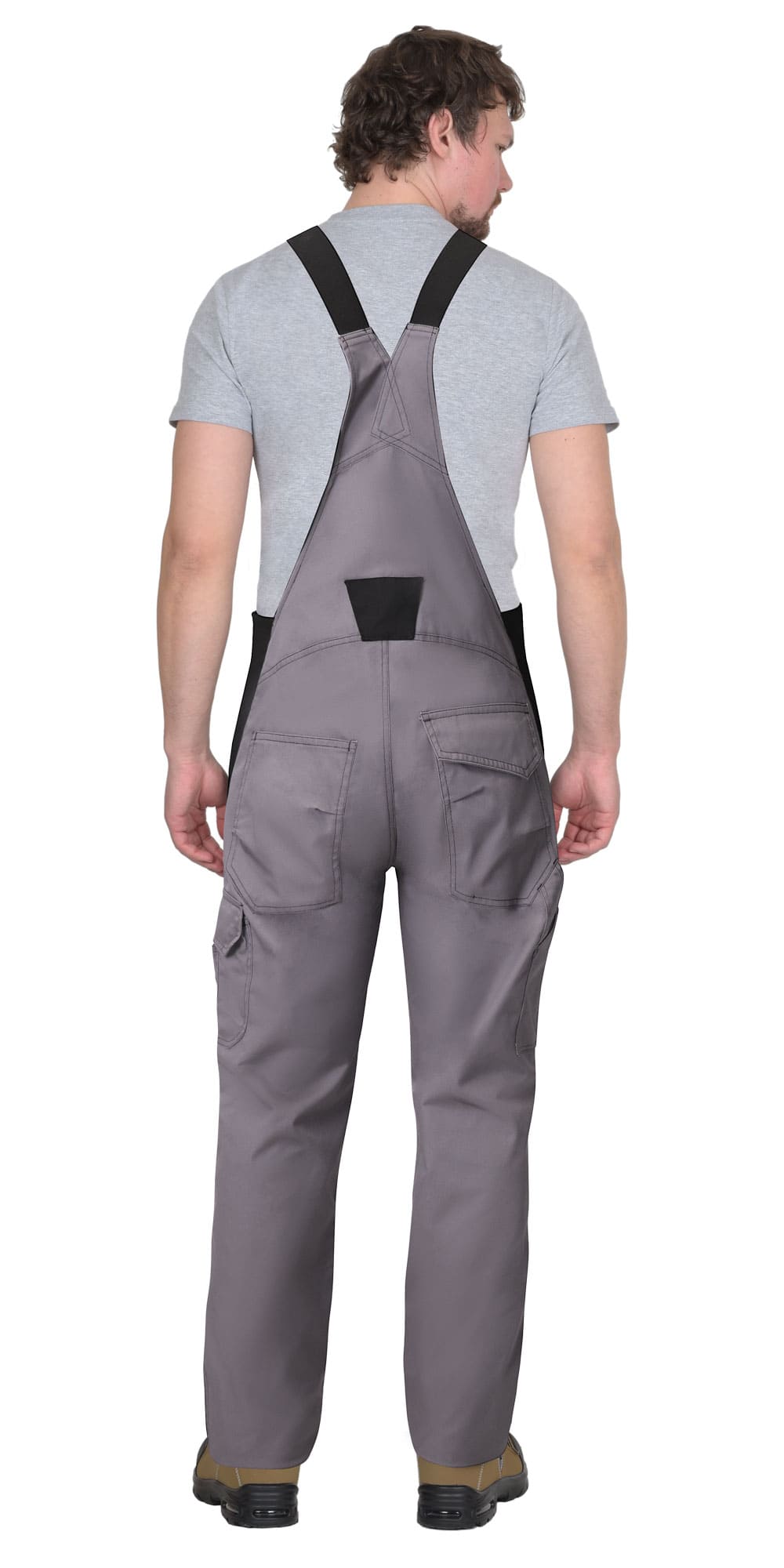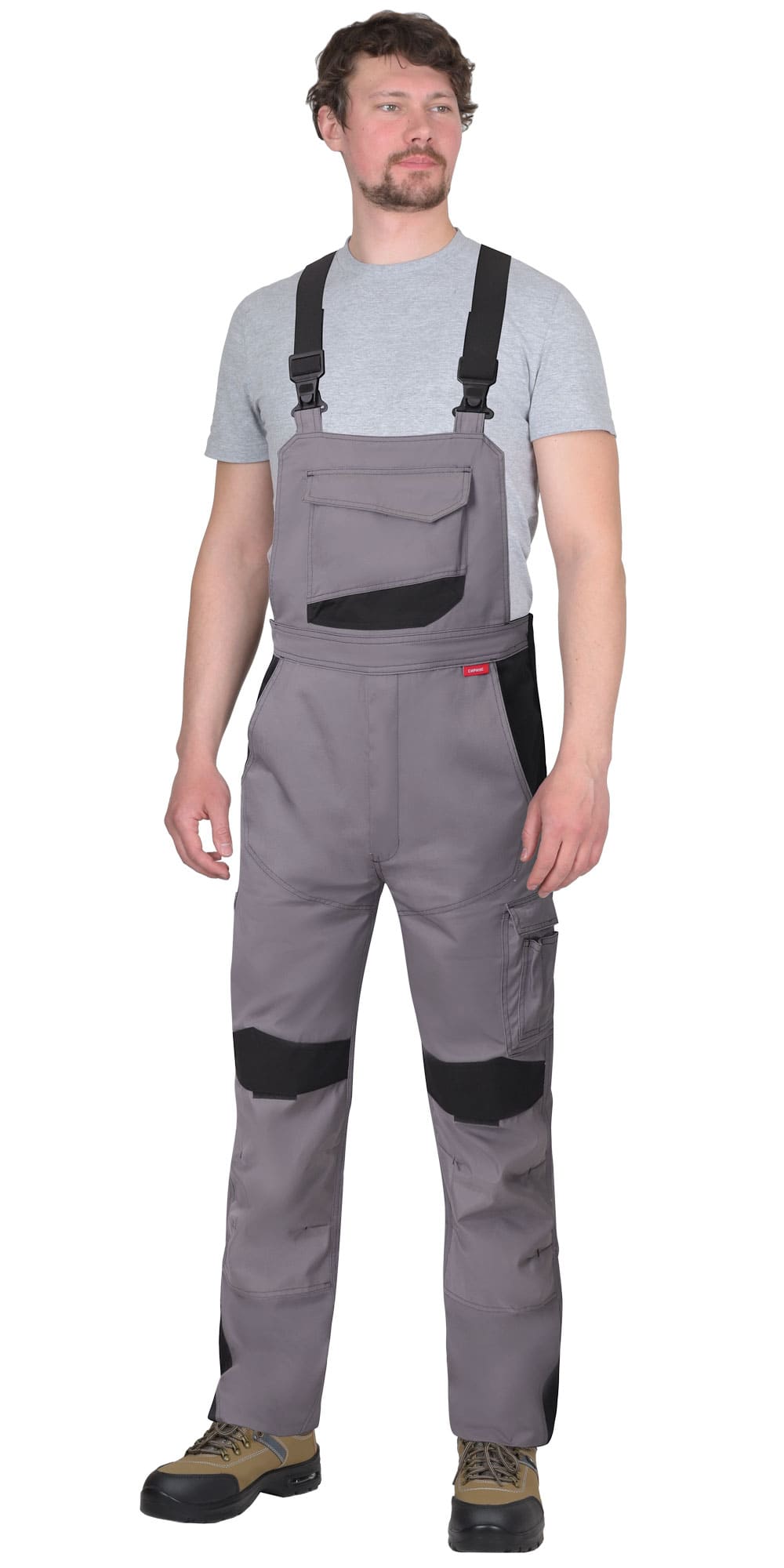 Полукомбинезон прямой с застёжкой спереди — гульфик с молнией, с отрезной грудкой, отрезной спинкой, с бретелями. В боковом шве полукомбинезона со стороны задней половинки вставка из эластичного материала для удобства использования. Полукомбинезон с карманами спереди, сзади и на боковых швах, с объёмными наколенниками из полиэфирной, плотной, непромокаемой ткани с верхним входом для амортизационного вкладыша. Бретели регулируются по длине.