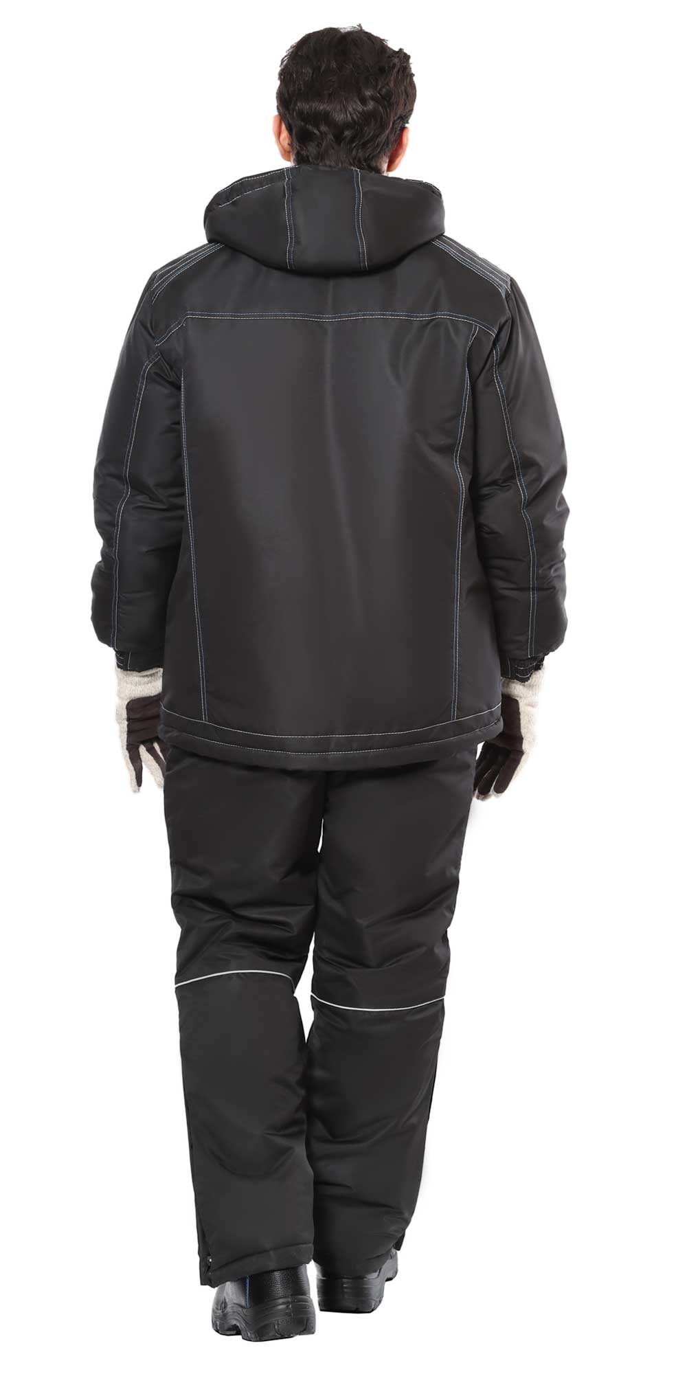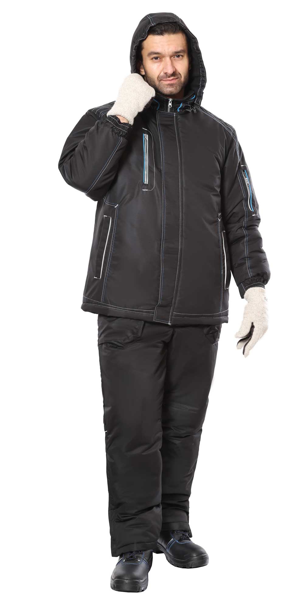 Зимняя рабочая куртка для мужчин длинная, прямого силуэта, с притачной утеплённой подкладкой и съёмным капюшоном, с воротником-стойка, с центральной бортовой застёжкой на молнию, с ветрозащитной планкой застегивающейся на липучке и с подпланкой, с верхним и нижними прорезными карманами. Рукава втачные с манжетами, частично стянутыми на резинку, на левом рукаве карман на молнии, с внутренним карманом с молнией. Куртка с контрастными кантами по карманам и воротнику.