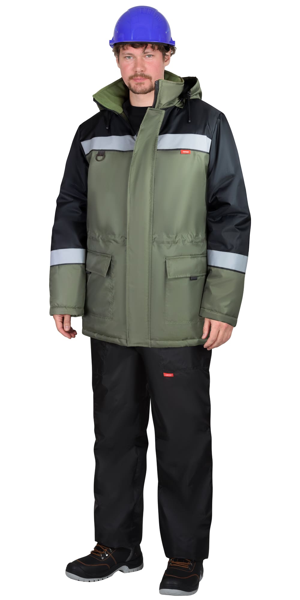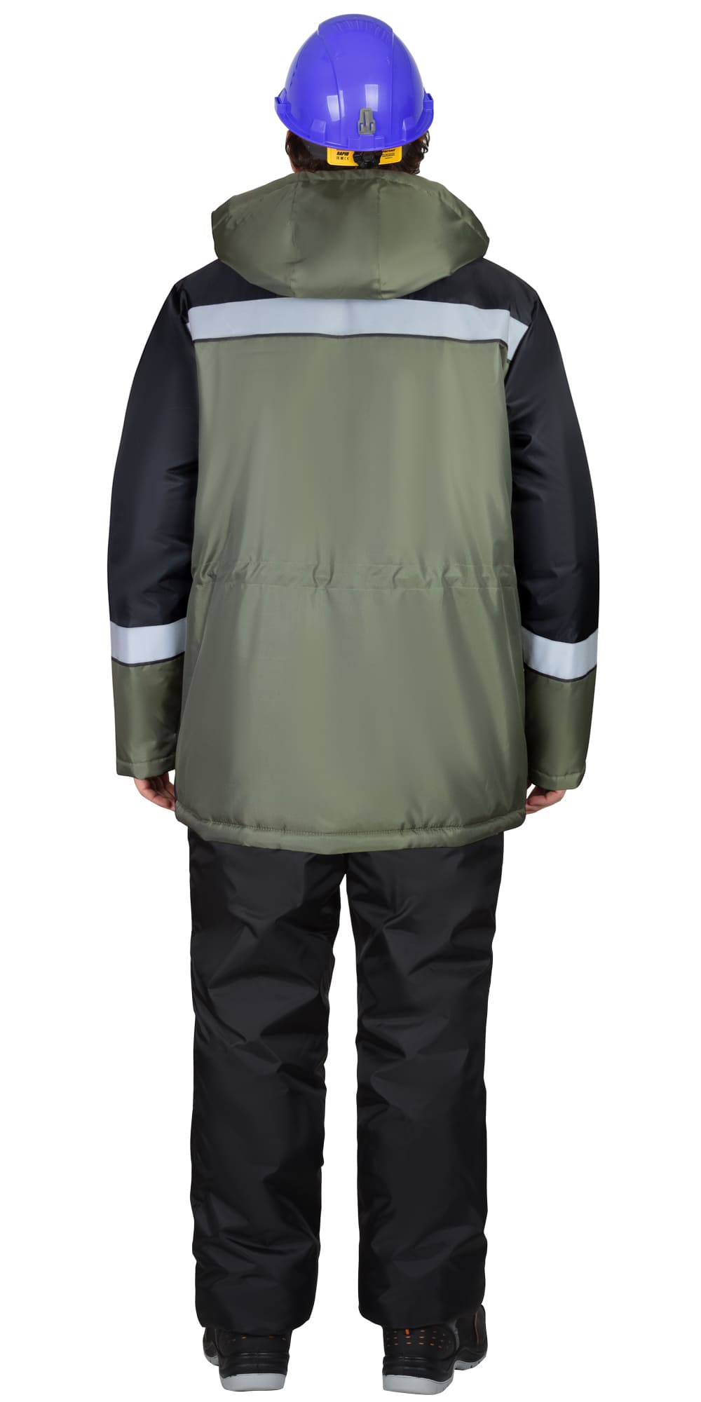 Куртка утепленная зимняя прямого силуэта, удлинённая, с утеплённой подкладкой, с центральной застежкой молния с ветрозащитным клапаном, с втачным воротником-стойка внутренний воротник из флиса, с втачными рукавами с внутренней трикотажной манжетой, с нижними накладными карманами с клапаном и карманом на подкладке. Куртка с кулиской по талии, со съёмным капюшоном, с лентой светоотражающей. В куртке предусмотрено крепление бейджа.