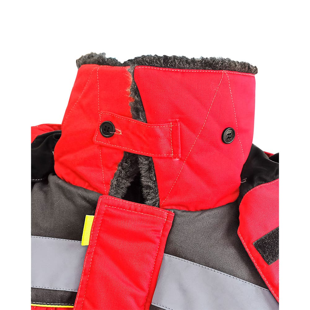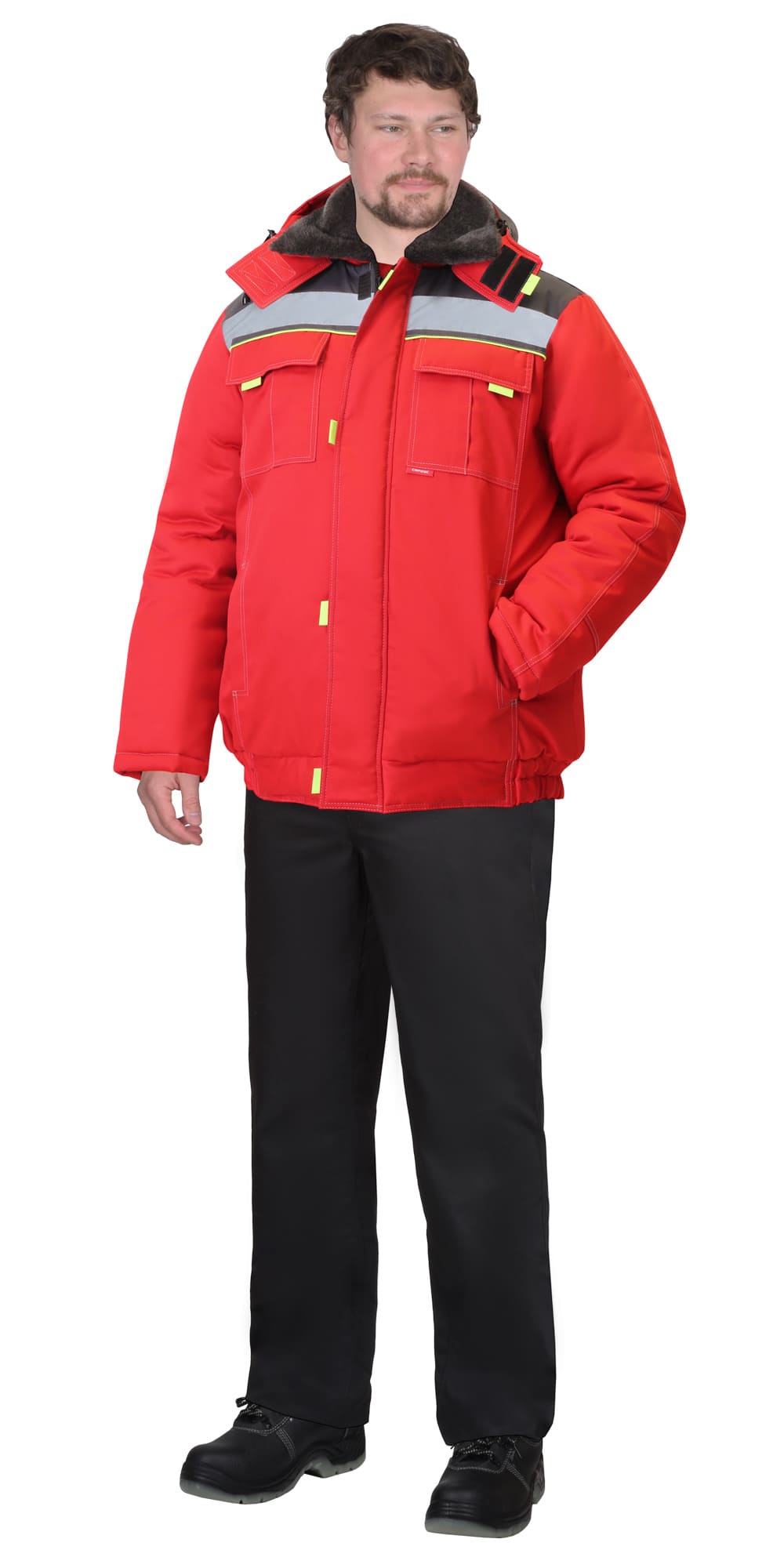 Куртка зимняя укороченная, с утеплённой подкладкой, с отложным меховым воротником, с центральной застёжкой на молнию и ветрозащитным клапаном, со съёмным утеплённым капюшоном, с верхними накладными карманами с клапанами на липучках, с нижними карманами в рельефных швах и карманом на подкладке. Рукава с налокотниками и внутренними трикотажными манжетами. В куртке предусмотрена СОП для обеспечения видимости при любом освещении.