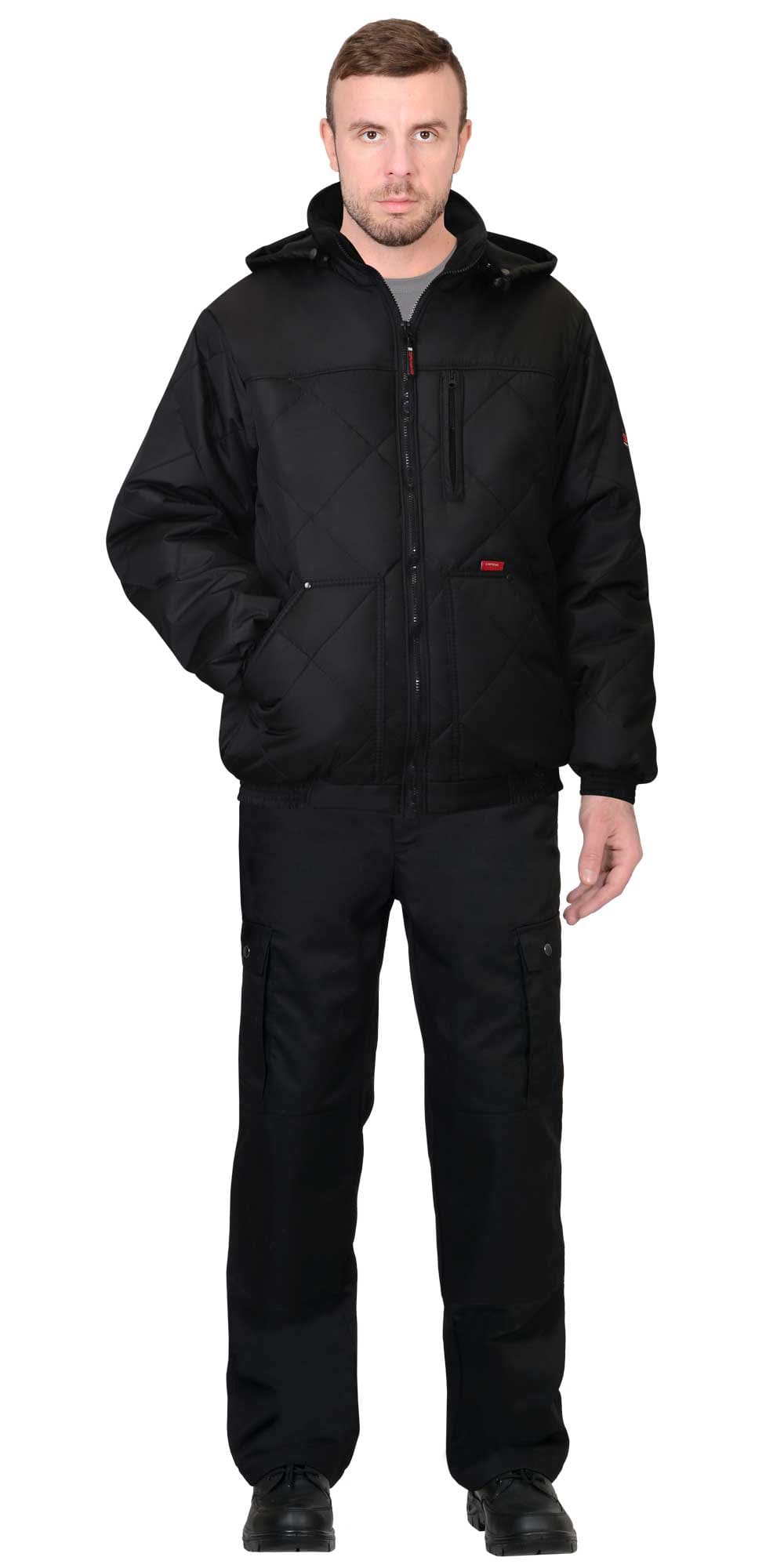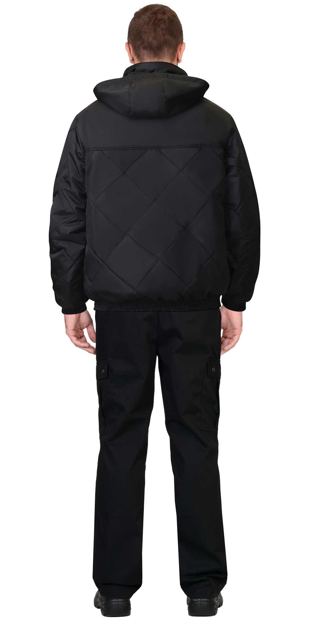 Куртка утепленная мужская спецодежда, укороченная, по низу на притачном поясе с эластичной лентой, на подкладке из флиса, со съёмным капюшоном, с центральной бортовой застёжкой на молнию и воротником стойка. Изделие с верхним нагрудным прорезным и нижними накладными карманами. Рукава втачные с притачными манжетами, манжеты частично стянуты на эластичную ленту. Полочки, спинка, рукава и нижние карманы куртки выстеганы с утеплителем в виде ромбов.