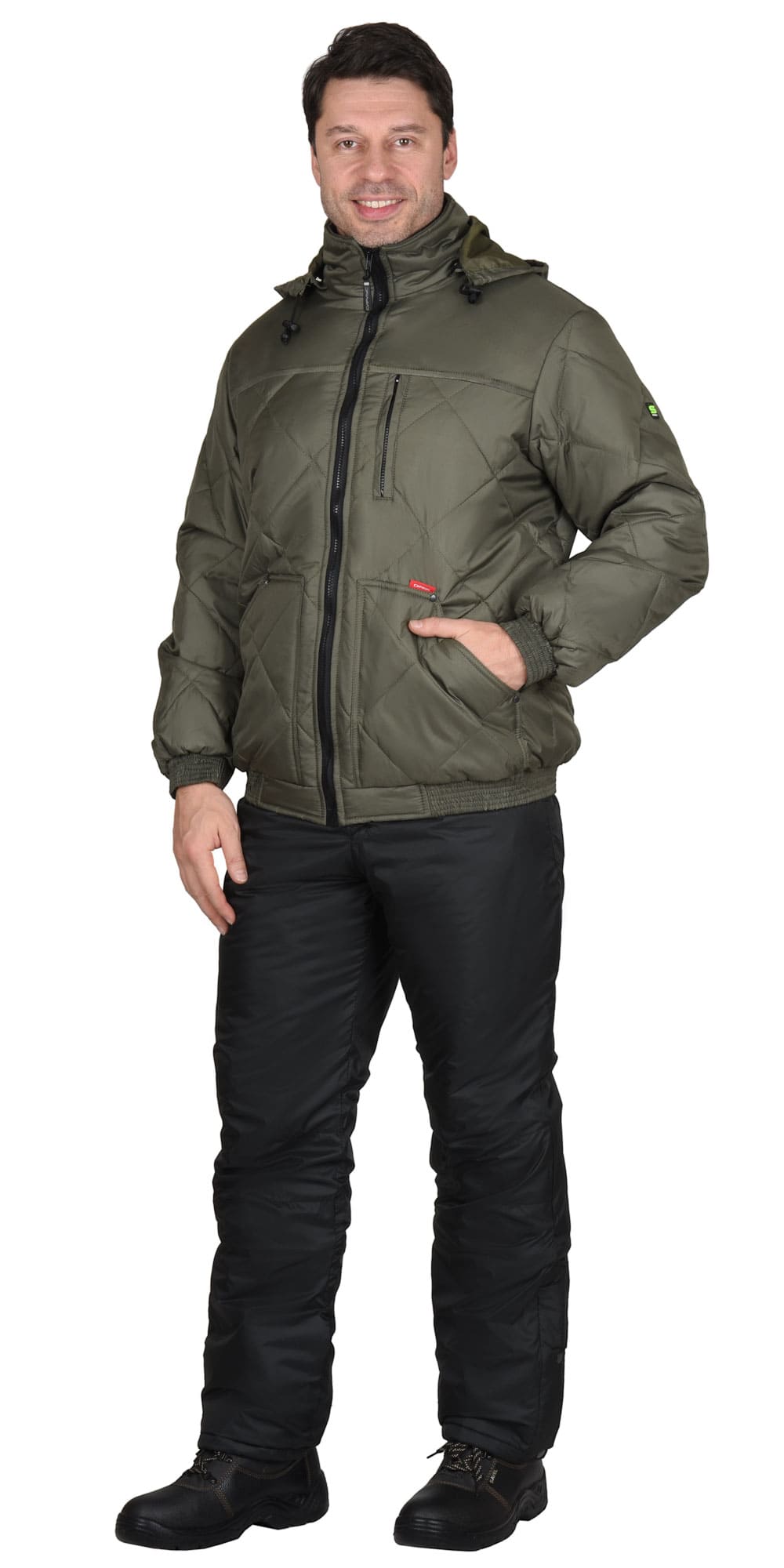 Куртка утеплённая, укороченная, по низу на притачном поясе с эластичной лентой, на подкладке из флиса, со съёмным капюшоном, с центральной бортовой застёжкой на молнию и воротником стойка. Изделие с верхним нагрудным прорезным и нижними накладными карманами. Рукава втачные с притачными манжетами, манжеты частично стянуты на эластичную ленту. Полочки, спинка, рукава и нижние карманы куртки выстеганы с утеплителем в виде ромбов.