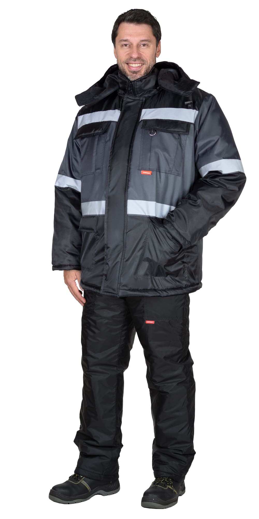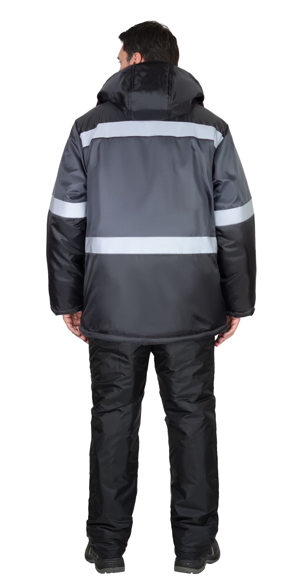 Куртка рабочая утепленная прямого силуэта на утепленной подкладке, удлиненная, с центральной застежкой на молнию до верха воротника, накрытую ветрозащитным клапаном от горловины до низа куртки, застегивается на потайные липучки. Куртка с воротником стойка, с верхними и нижними накладными карманами с клапанами, с втачными рукавами с внутренними трикотажными манжетами. Под клапаном левого нагрудного кармана расположена петля с полукольцом для крепления бейджа. Куртка со съемным капюшоном, который пристегивается к горловине куртки при помощи молнии.